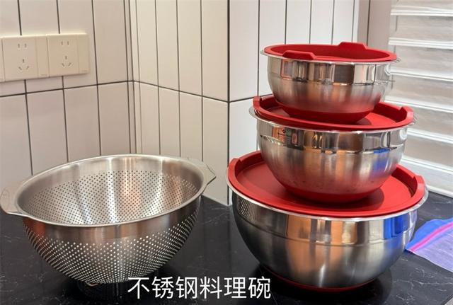 不锈钢不绝碗看着平平无奇,骨子是个变形金刚。大号拌沙拉,中号打蛋,小号腌蒜片,叠起来只占一只饭碗的地儿。盖子严到倒立不漏,我试过把酸奶+麦片塞包里带去公司,中午翻开还嘎嘣脆。别买太薄的,摔一次就变形,山姆的2.5mm壁厚摔地上只会响不会凹。