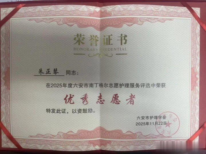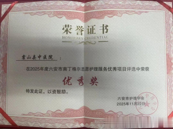 近日,从六安市照应学会传来捷报:在2025年度南丁格尔志愿照应就业优秀面目评比中,霍山县中病院南丁格尔志愿就业队讲演的面目荣获“优秀奖”,同期,面目崇拜东说念主朱正琴同道荣获市级“优秀志愿者”称呼。