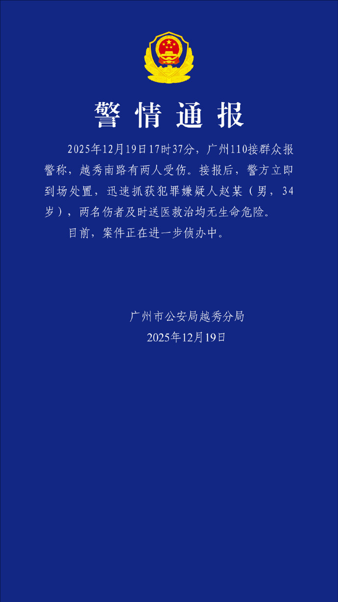 12月19日晚,广州市公安局越秀分局发布警情通报,19日17时37分,广州110接天下报警称,越秀南路有两东谈主受伤。接报后,警方立即到场处理,赶紧持获罪人嫌疑东谈主赵某(男,34岁),两名伤者实时送医救治均无生命危境。现在,案件正在进一步侦办中。